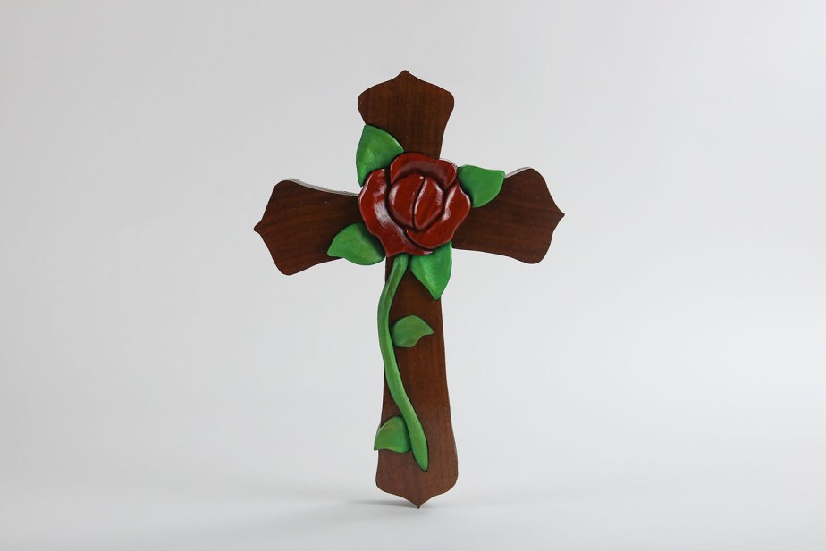 Cross with Rose Intarsia A wooden cross with an embedded Rose of Redheart with the stems / leaves died green. Related