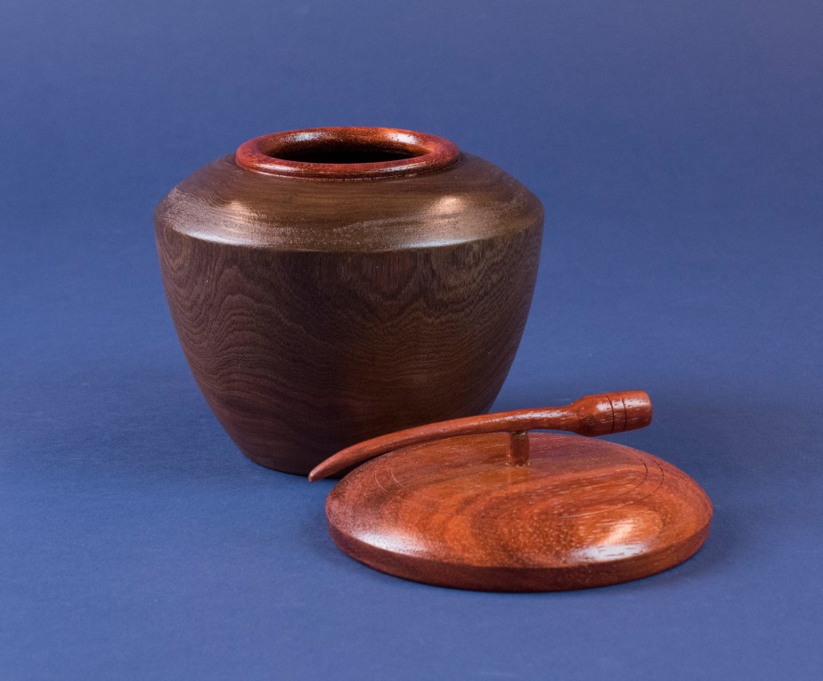 Turned / carved Oriental style covered bowl of walnut and blood wood