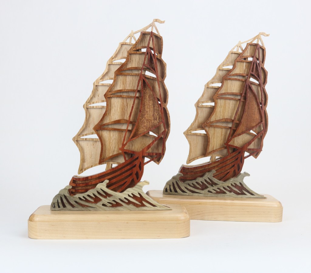 Sailing Ships Intarsia Sailing ships made of layered Maple, Mahogany, Blood Wood with Blue Pine for the water. The base is Maple. Related